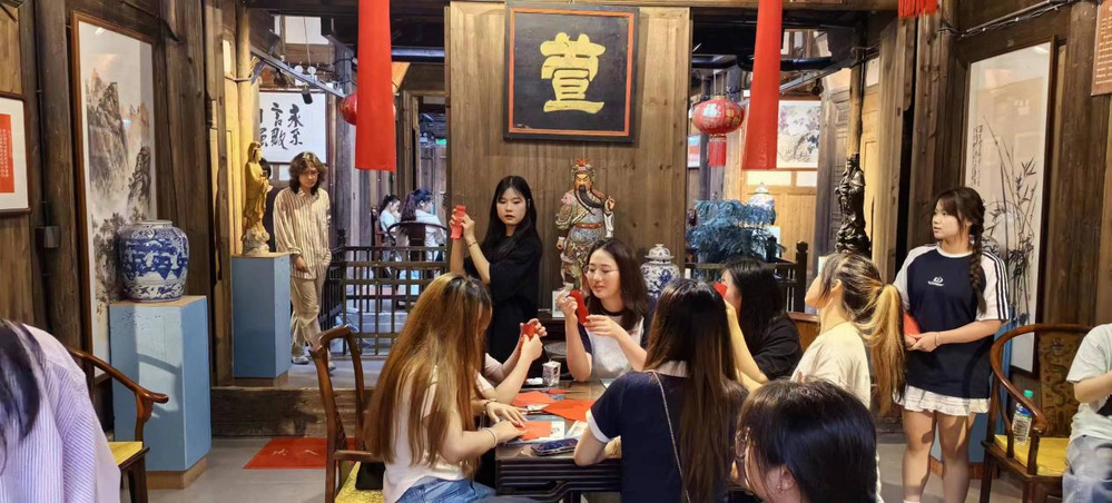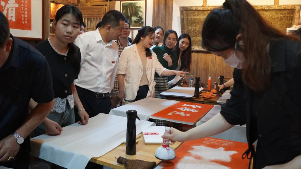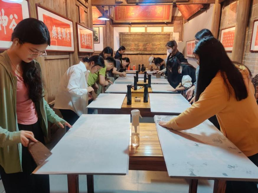 参观完匾额博物馆,学子们分批学习了拓印、剪纸等非遗技艺。非遗传承人在演示过后,详细讲解了操作的流程和技巧。拓印是一门起源于东汉的古老印刷术,为了在薄薄地宣纸上复现出石板、木刻上精美书法,拓印者需要保持极高的专注度和极强的耐心。同学们在操作中静思凝神,平心屏息,在传承人的指导下陆陆续续完成了自己的拓印作品。22级汉语国际教研专业的彭佳冕同学表示,在拓印的过程中,我整个人仿佛进入了一种“心外无物”的境界,这种身心自由的体验非常美妙,以后我要多多学习非遗文化。
