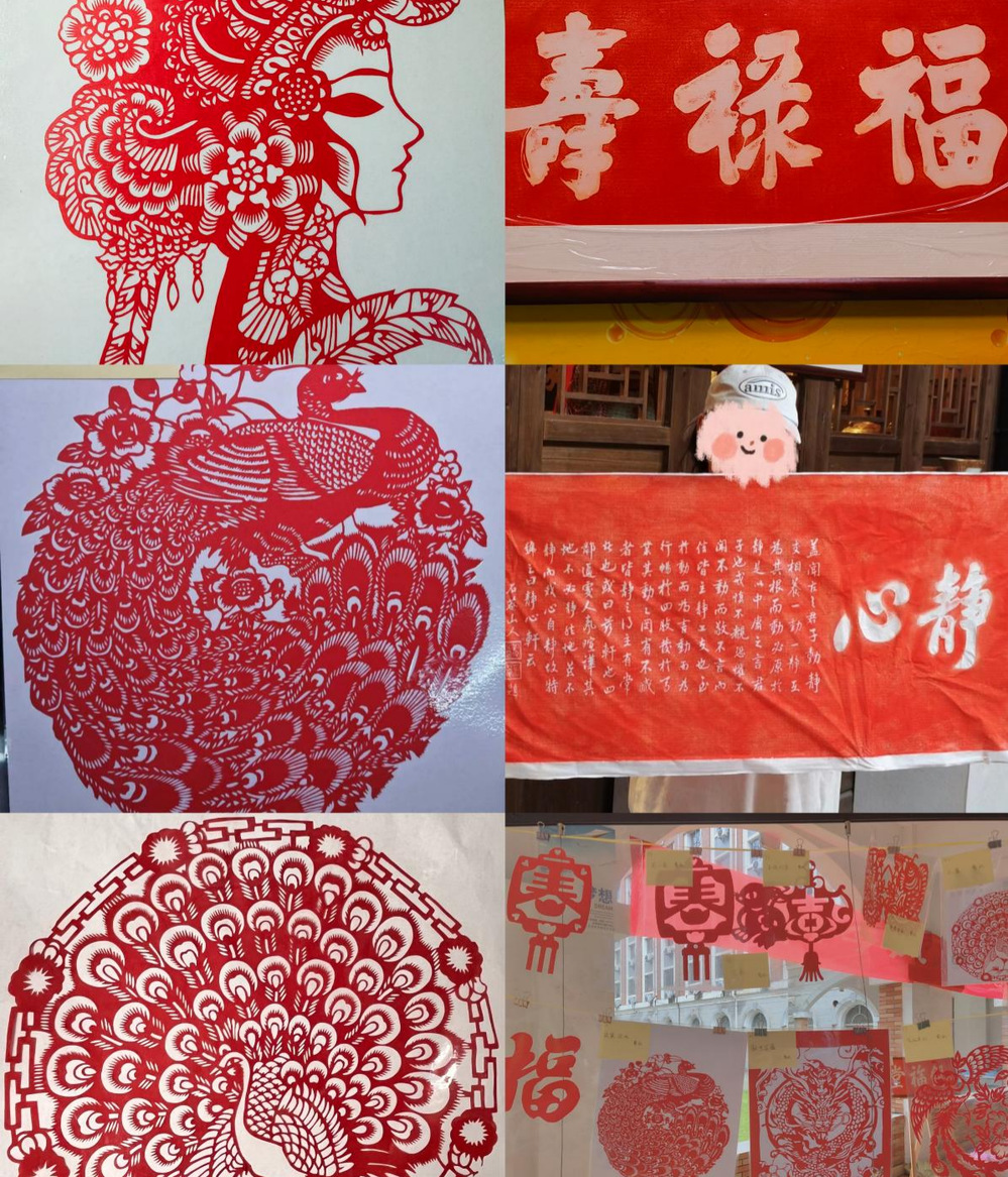 本次传统文化作品展以“古韵今风,传承创新”为主题,展出十余类传统文化作品,有“红烛摇影夜裁生,巧手翻飞纸做梅”的各类剪纸;有“朱砂轻点墨香浮,纸上美文话悠悠”的手工拓印;有“丹青焕彩梦中景,油彩交织夜与晨”的各式油画,还有手工饰品、簪花、刺绣、书法等众多形式的作品,它们在雨后初阳的朦胧中绽放着光彩。