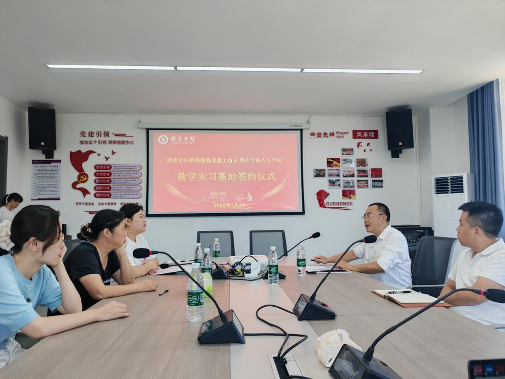 7 月 4 日下午,我院与抚州市临川白浒窑陶瓷工艺非遗工坊教学实习基地签约仪式在人文楼514会议室举行。仪式由我院行政负责人颜小英主持,抚州市临川白浒窑陶瓷工艺非遗传承人张志刚先生,以及我院相关部门负责人共同出席了签约仪式。