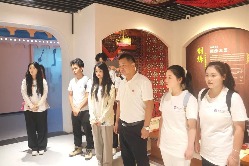 7月15日,在阿克陶县铸牢中华民族共同体意识展览馆,刘云海校长与实践队师生共同追溯各民族交往交流交融的历史脉络。从古代丝绸之路的文明互鉴到新时代援疆工作的丰硕成果,从柯尔克孜族刺绣的精美纹样到多民族共居社区的和谐图景,师生们在珍贵史料与实物展品中深刻感悟“中华民族多元一体”的厚重底蕴。刘云海强调:“青年一代要做民族团结的忠实践行者,既要当好历史成果的守护者,更要成为未来发展的建设者,让民族团结之花常开长盛。”