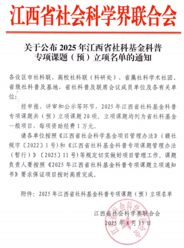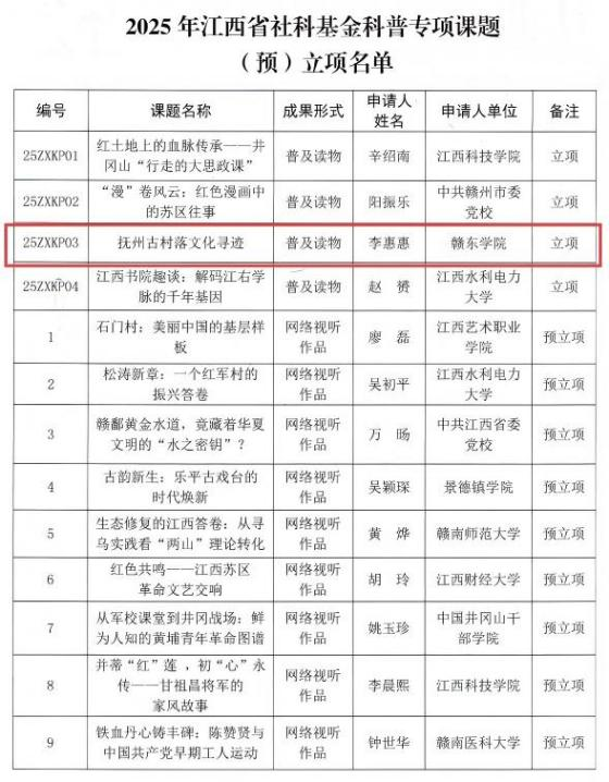 近日,江西省社科联发布了《关于公布2025年江西省社科基金科普专项课题(预)立项名单的通知》,我院李惠惠老师的《抚州古村落文化寻迹》喜获2025年江西省社科基金科普专项课题立项。这是继我院廖姝雅老师获2024年江西省社会科学基金项目立项后,又在社科领域取得的新突破。