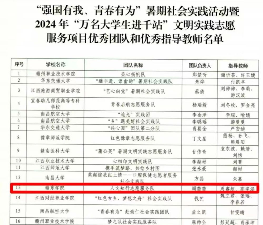 近期,江西省教育厅发布了《关于公布“强国有我、青春有为”暑期社会实践活动暨2024年“万名大学生进千站”文明实践志愿服务项目获奖结果的通知》,我院在活动中斩获优秀团队1个,优秀指导教师2人。