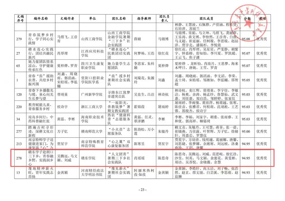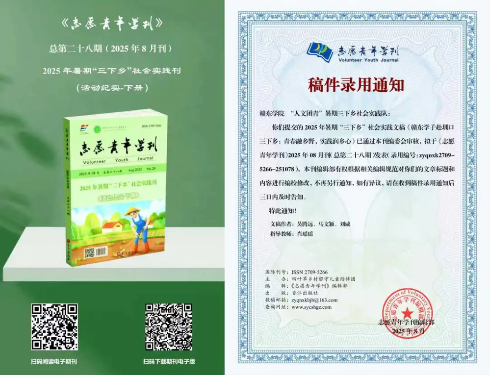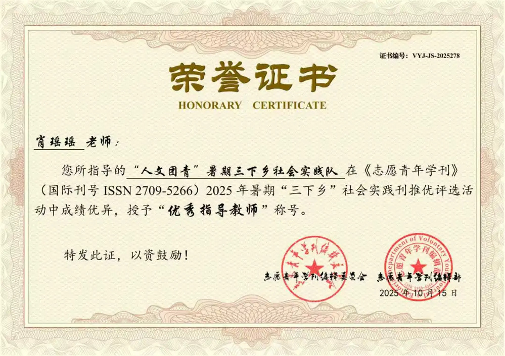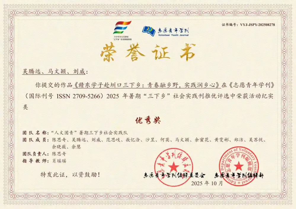 近日,由《志愿青年学刊》编辑部组织开展的2025年暑期“三下乡”社会实践刊征稿、审稿及录用工作已顺利完成,并同步公布录刊评优结果。其中,williamhill中文“人文团青”暑期三下乡社会实践队提交的作品《赣东学子赴圳口三下乡:青春融乡野,实践润乡心》荣获活动纪实类优秀奖,肖瑶瑶老师获评“优秀指导教师”称号。
