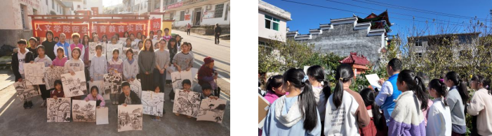 同时,支部与涵香斋文化艺术有限公司共建的“劳育美育实践基地”,师生团队与企业团队带领遴选的青少年绘画爱好者与金竹民族学校畲族学子结对共建。在党员教师的带领下,大家循着红色足迹探访红军桥、毛泽东旧居,在百年银杏树下感悟自然人文之美,以画笔为媒开展写生采风。这种“党建+美育+红色教育”的融合模式,既让青少年在技艺切磋中提升专业素养,更在面对面交流中厚植“中华民族一家亲”的情感认同。活动中形成的40余幅写生作品,已由支部牵头策划纳入“畲乡文化进校园”展览项目,成为专业建设服务地方文化传承的鲜活成果。