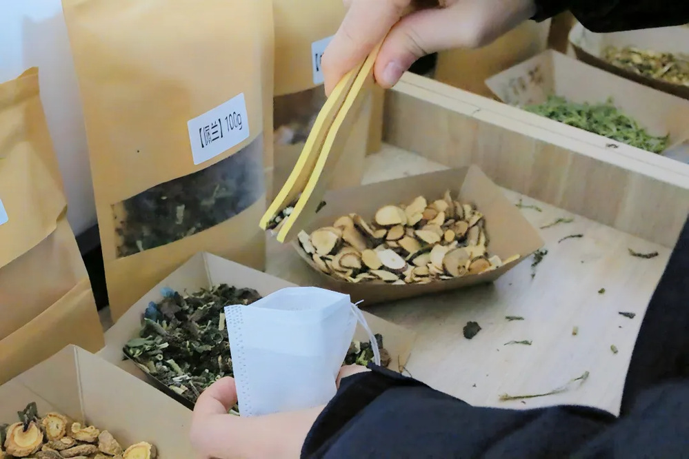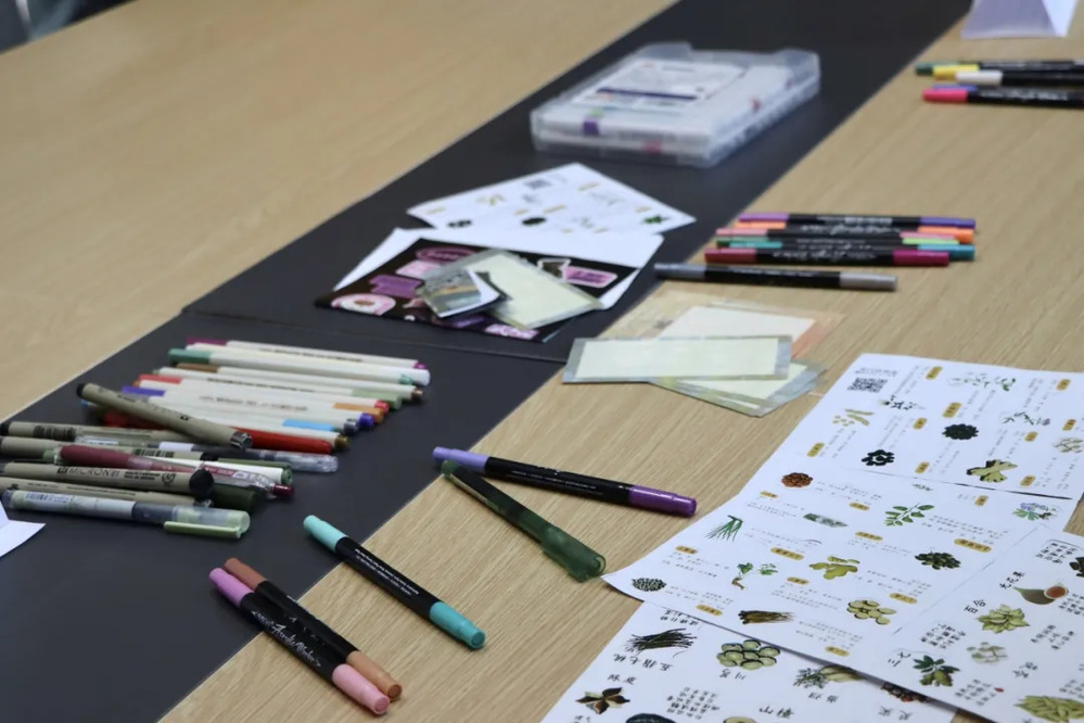 活动开始前,现场长桌上摆好10余种素色、印花布料,以及防风、佩兰、桂枝等11种标注着“辟秽”“安神”“醒脾”功效的中草药香料,还有涂鸦笔等工具方便同学们即兴创作。