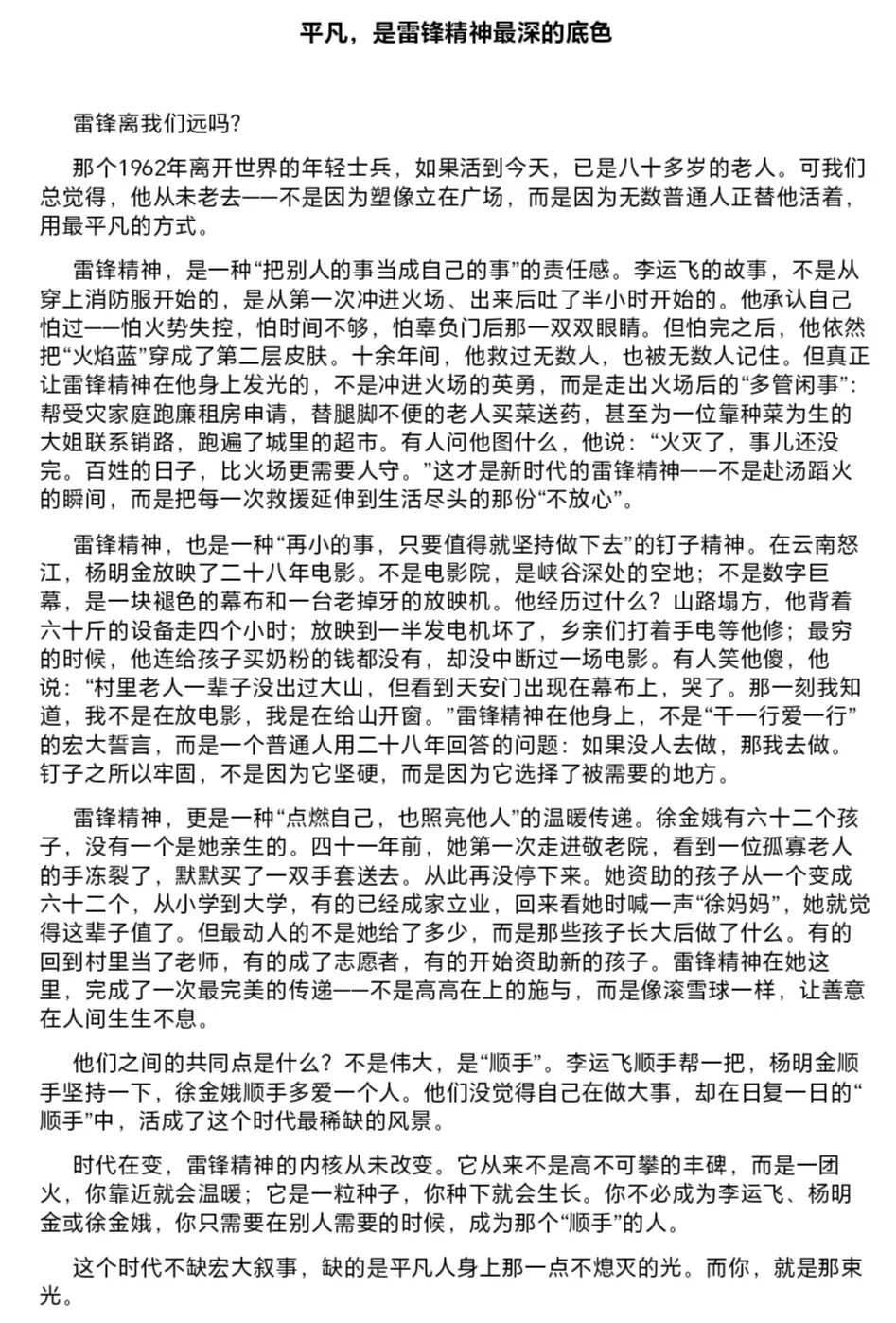 “雷锋月”的篇章虽已落幕,但启动仪式的誓言、红色观影的感动、学风督查的坚守、专题学习的感悟、支部团日的践行、艺术创作的赤诚及表彰大会的荣光,已化作人文学子心中不灭的志愿火种。未来,学院将持续引领青年践行雷锋精神,让志愿之花绽满校园,让青春在奉献中闪光,为学校本科教学工作合格评估注入青春力量。